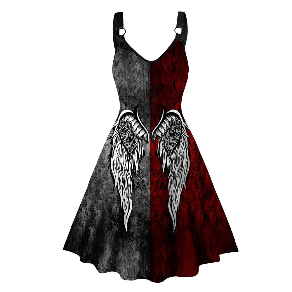 Dieses auffällige Gothic Kleid ist mit einem faszinierenden Engelsflügelmotiv verziert, das Ihrem Kleiderschrank eine himmlische und geheimnisvolle Note verleiht. Hergestellt aus Polyester und Nylon, ist dieses Kleid sowohl langlebig als auch bequem.