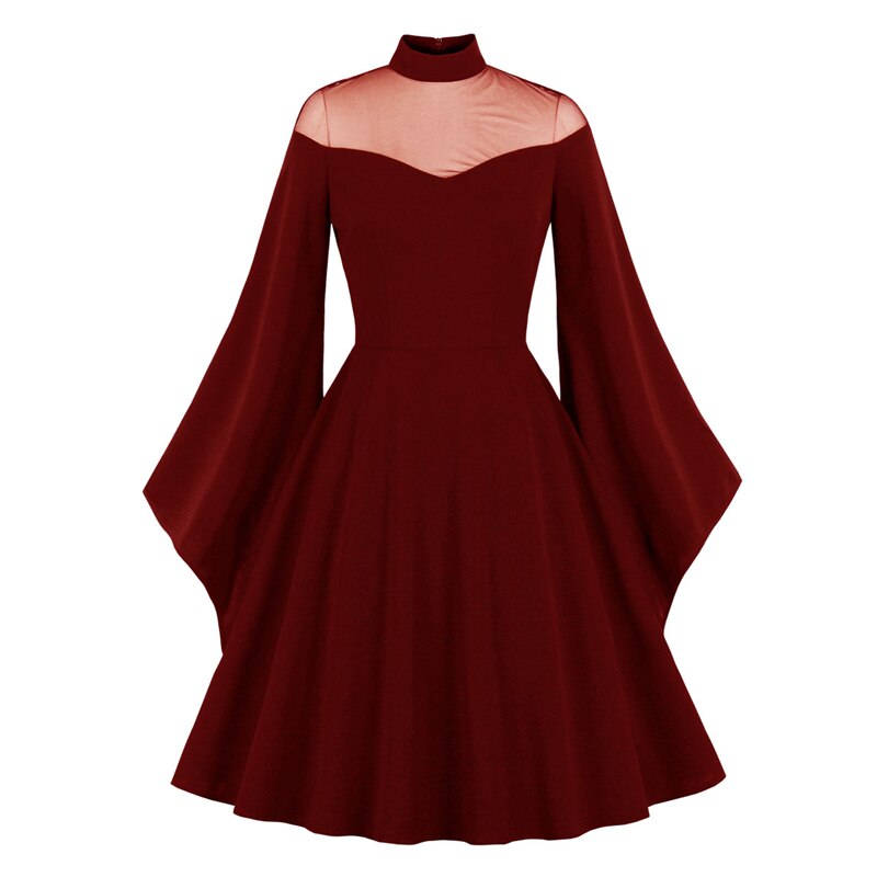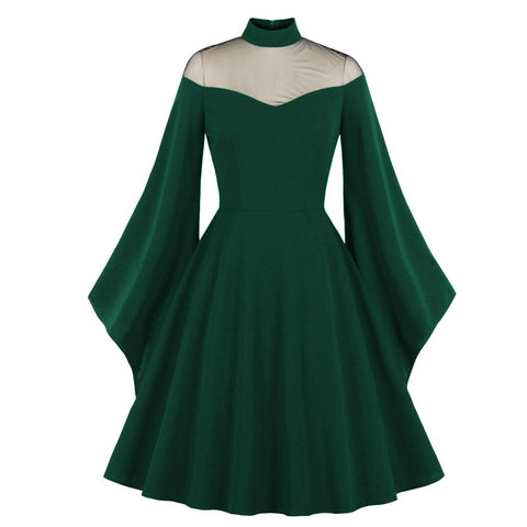 Die langen Trompetenärmel weiten sich anmutig und fügen eine dramatische, theatralische Note hinzu, die sofort Aufmerksamkeit erregt. Der hohe Kragen, kombiniert mit einem transparenten Einsatz an den Schultern, verleiht eine Note von Raffinesse und Eleganz. Der figurbetonte Schnitt im Brustbereich und der ausgestellte Rock ab der Taille schaffen eine schmeichelhafte, feminine Silhouette.