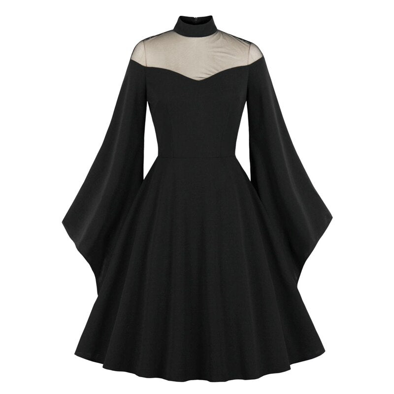 Das Goth Kleid mit Trompetenärmeln ist ein spektakuläres Kleidungsstück, das Eleganz und Geheimnis verbindet, ideal für besondere Anlässe oder thematische Gothic-Events. Hergestellt aus synthetischer Faser, bietet dieses Kleid außergewöhnlichen Komfort und Haltbarkeit.
