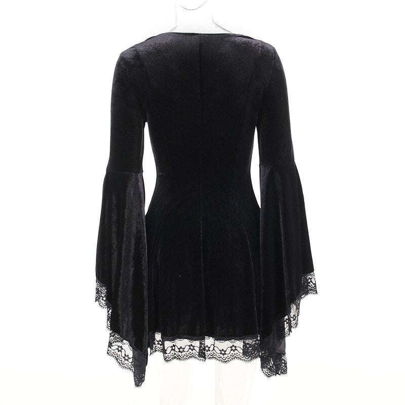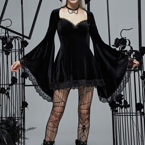 Hergestellt aus Polyester und Samt, bietet dieses Gothic Kleid eine weiche und luxuriöse Textur, die die Silhouette schmeichelhaft umschmeichelt. Die langen, ausgestellten Ärmel fügen eine dramatische Note hinzu, während der Saum und das Dekolleté mit zarter Spitze eine romantische Note verleihen.