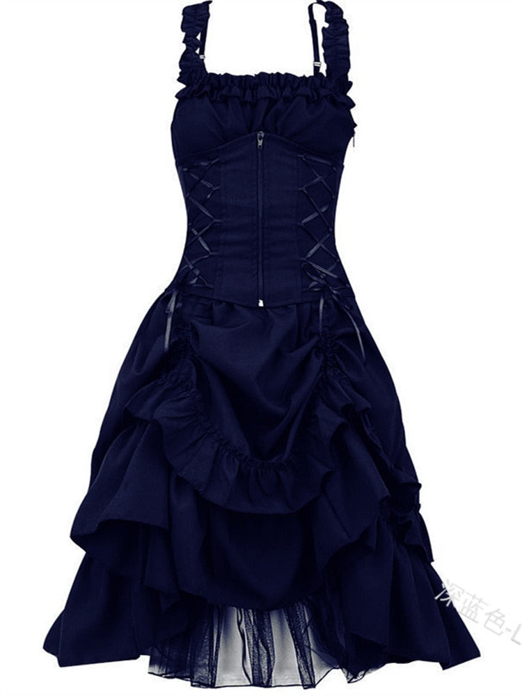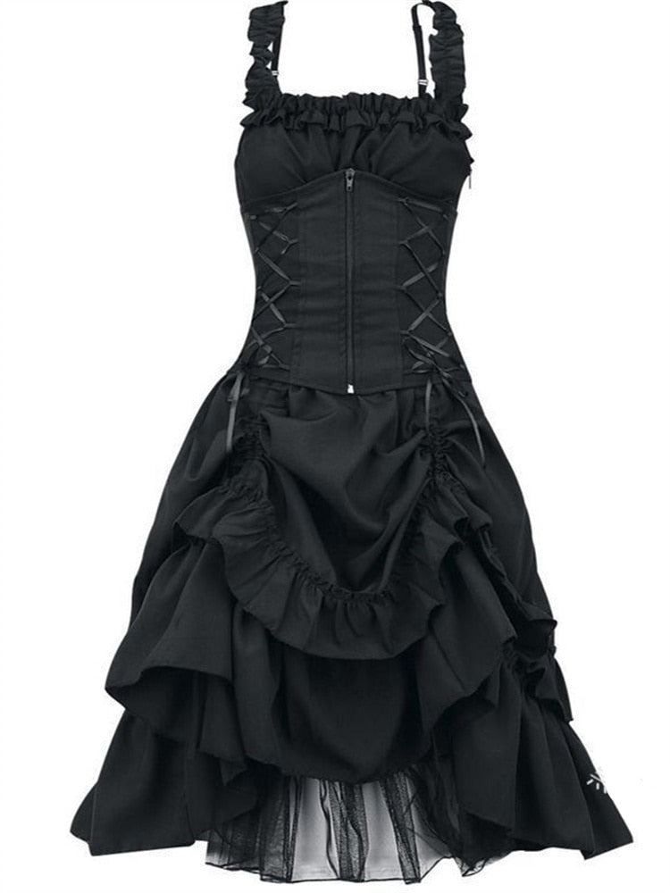 Der voluminöse Rock, verziert mit komplexen Rüschen und Drapierungen, fügt eine theatralische und faszinierende Dimension hinzu. Der asymmetrische Schnitt, kurz vorne und länger hinten, schafft einen spektakulären Effekt, der alle Blicke auf sich zieht. Perfekt für besondere Anlässe, Gothic-Events oder jede Abendveranstaltung, bei der Sie sich mit Eleganz und Kühnheit abheben möchten.