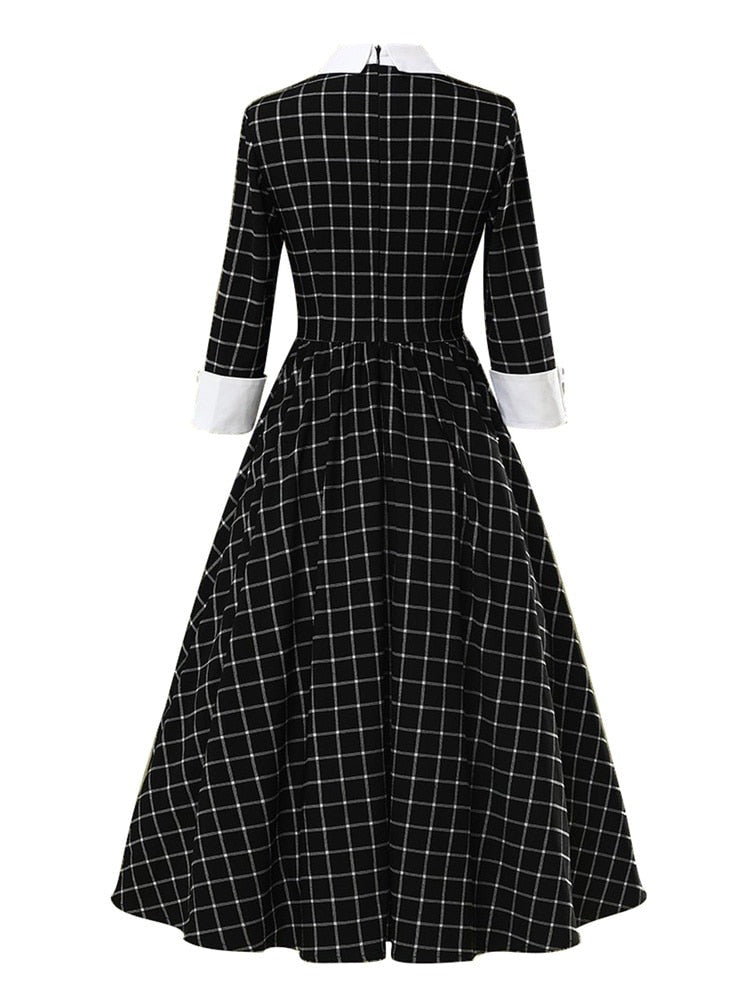Dieses elegante Schwarze Gothic Kleid vereint sowohl Raffinesse als auch klassischen Stil. Hergestellt aus Baumwolle, bietet es optimalen Komfort und eine raffinierte Silhouette. Die Dreiviertelärmel und der weiße Kragen setzen einen zeitlosen, schicken Akzent. Das schwarz-weiße Karomuster verleiht eine moderne und elegante Dimension.