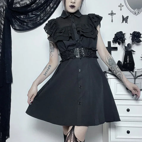 Der klassische Hemdblusenschnitt trifft auf feminine Raffinesse: die Vorderseite ist mit eleganten Knöpfen verziert, während der Rüschenkragen und die doppellagigen Volants an den Schultern dem Kleid Bewegung und Struktur verleihen. Die Taille wird durch einen breiten, geschnürten Gürtel betont, der eine wunderschön geformte Silhouette zaubert und das Design mit einem Hauch viktorianischer Strenge abrundet.