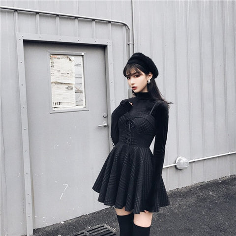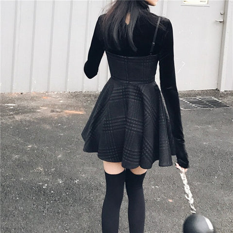 Das Schwarze Goth Kleid mit Korsett ist eine perfekte Mischung aus kühlem Stil und Raffinesse. Hergestellt aus Polyester und Lanon, bietet es Haltbarkeit und Komfort und sorgt gleichzeitig für eine elegante Silhouette. Das ärmellose Design mit dünnen Trägern betont die Schultern, während das Korsett mit Frontschnürung einen gotischen Charme verleiht und eine individuelle Anpassung ermöglicht.