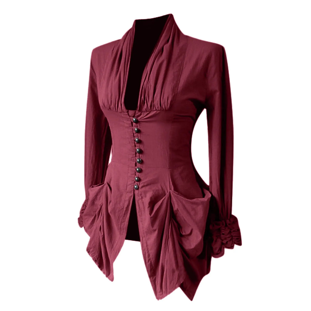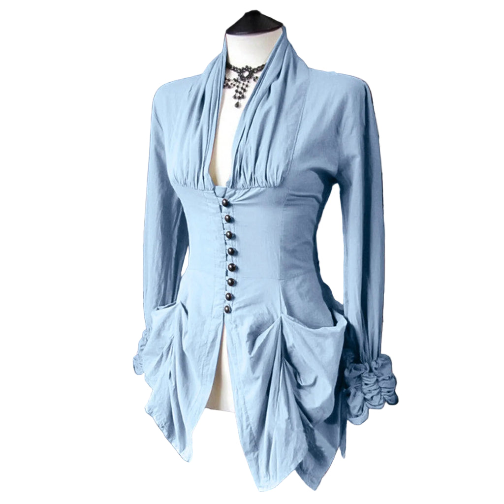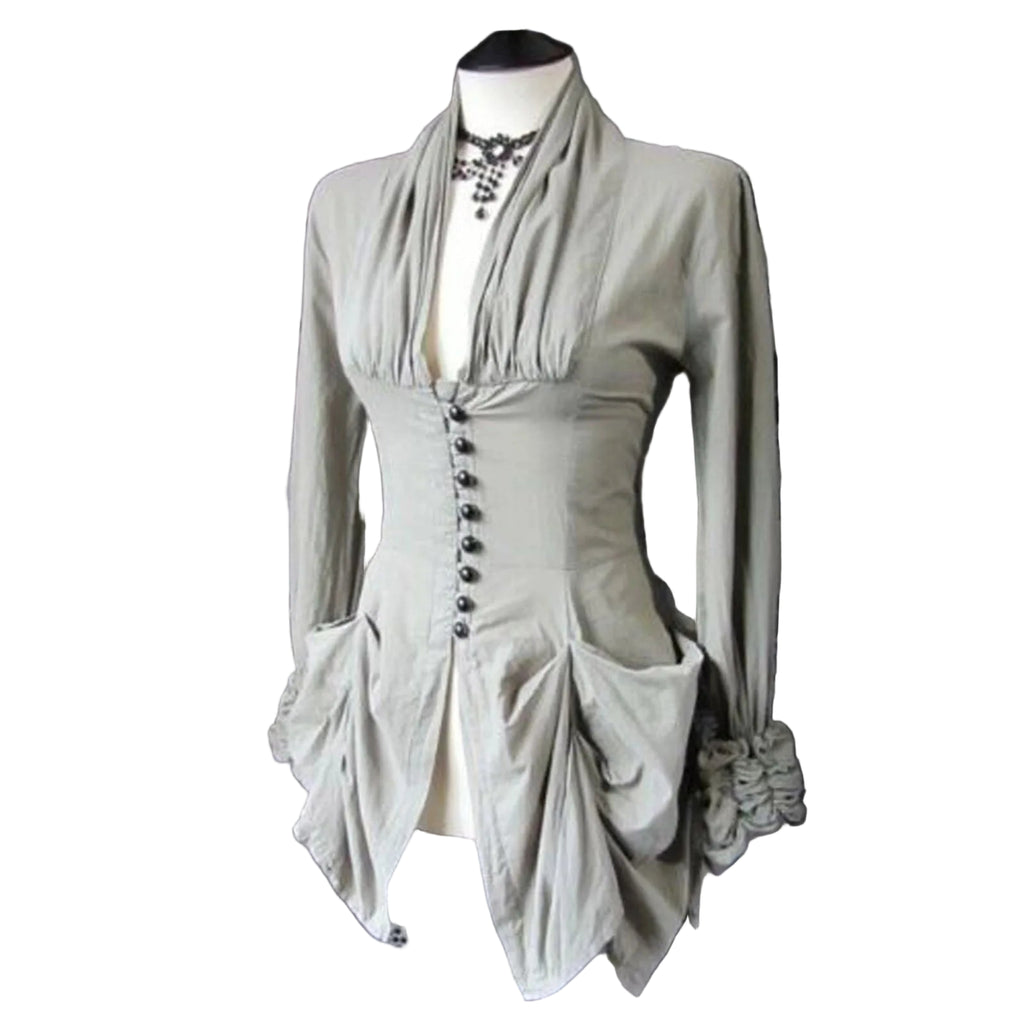 Die Viktorianische Adelsbluse verkörpert den Stolz und die Raffinesse vergangener Jahrhunderte. Mit ihrem tiefen Schalkragen und den elegant gerafften Details an Ärmeln und Saum erinnert sie an die Garderobe aristokratischer Damen, die durch Haltung und Anmut bestachen. Der figurbetonte Schnitt mit der mittigen Knopfleiste betont die Taille und schafft eine erhabene, königliche Silhouette.