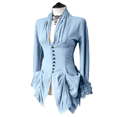 Besonders markant sind die kunstvoll gefalteten Partien am unteren Saum, die der Bluse eine fast skulpturale Form verleihen. Diese Details verleihen ihr nicht nur Tiefe, sondern auch einen Hauch von Theatralik, der an prunkvolle Empfänge und Ballnächte erinnert. Ein Kleidungsstück, das Nostalgie, Opulenz und Eleganz in perfekter Harmonie vereint – ein Must-have für Liebhaberinnen viktorianischer Mode und Steampunk-Ästhetik.