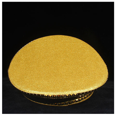 Der Hut ist mit funkelnden goldenen Pailletten überzogen, die im Licht glitzern und einen Hauch von Luxus und Raffinesse hinzufügen. Die Ränder sind mit goldenen Nieten besetzt, die nicht nur die Struktur verstärken, sondern auch einen Hauch von Robustheit und Beständigkeit verleihen. An der Vorderseite des Hutes sind große, bernsteinfarbene Edelsteine angebracht, die wie königliche Insignien glänzen und den Status des Trägers unterstreichen.