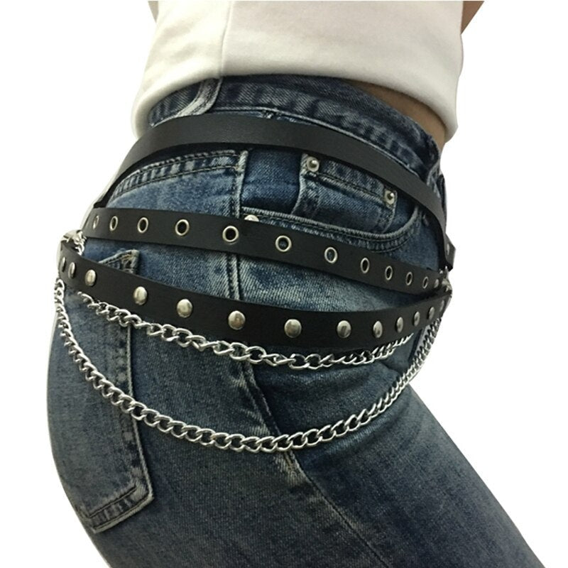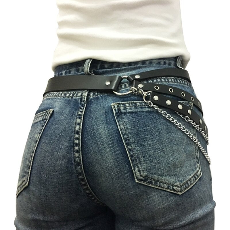 - Design: Mehrere Riemen und Ketten für einen punkigen Look