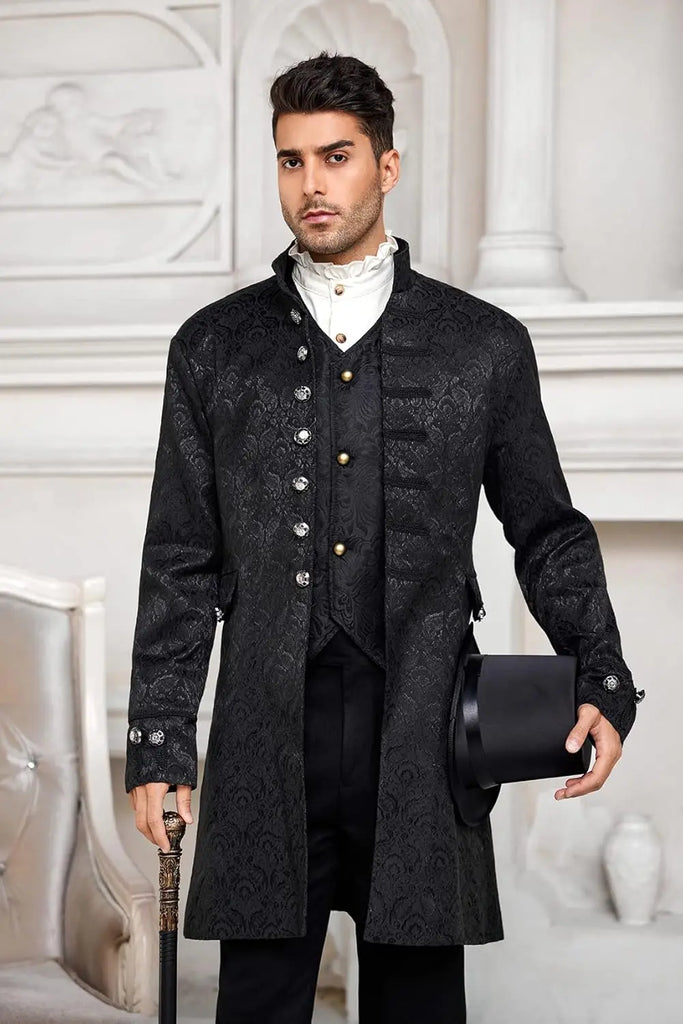 Die Steampunk Barockstil Jacke verbindet die prunkvolle Opulenz des Barock mit der rauen Faszination des Steampunk. Aufwendig gestaltete Knöpfe, ein fein strukturiertes Muster und der hohe Kragen machen dieses Kleidungsstück zu einem echten Hingucker für alle, die auf historische Raffinesse setzen.