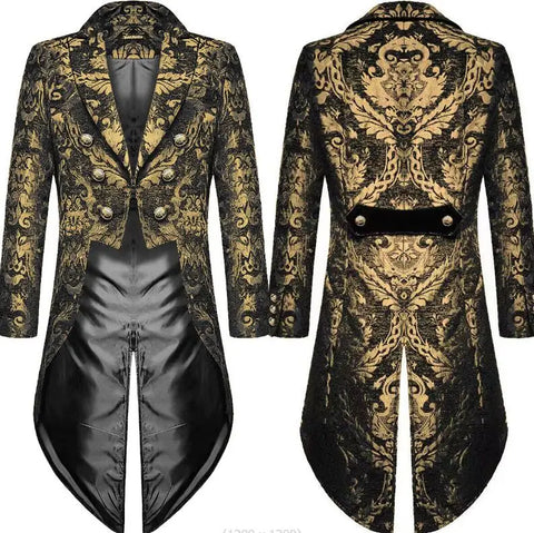 Gefertigt aus einem edlen Brokatstoff mit detailreichem Muster, präsentiert sich die Jacke als wahres Meisterstück viktorianischer Schneiderkunst. Die doppelreihige Knopfleiste mit kunstvoll verzierten Knöpfen unterstreicht den edlen Charakter, während das glänzende Innenfutter subtilen Luxus vermittelt. Sie ist wie geschaffen für alle, die ihren Auftritt mit einem Hauch von Geheimnis und Grandeur krönen möchten.
