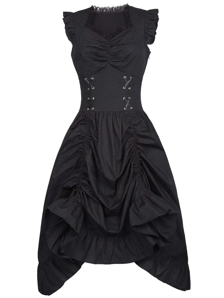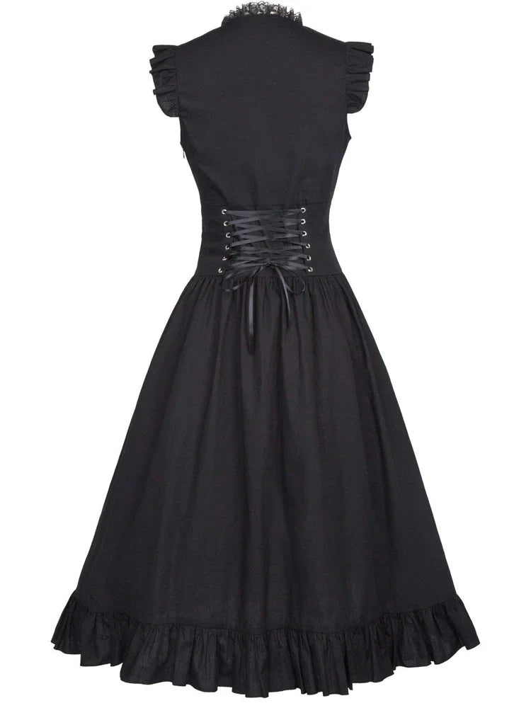 Mit seinem klassischen, ärmellosen Schnitt erinnert es an die festlichen Roben edler Damen vergangener Jahrhunderte. Die feinen Rüschen am Kragen und am Saum verleihen ihm eine zarte, feminine Note, während die kunstvolle Schnürung im Taillenbereich an die ikonischen Korsetts der viktorianischen Mode erinnert. Sie betont die Silhouette perfekt und bringt eine subtile Sinnlichkeit in den Look.