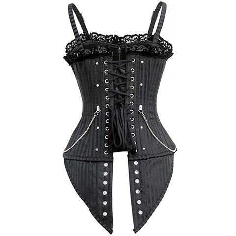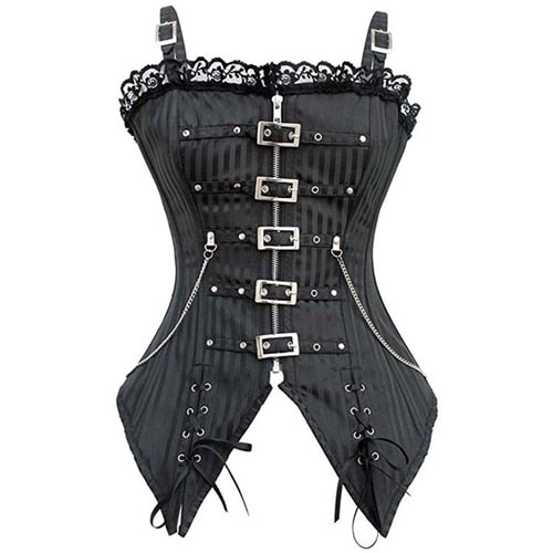 Das Gothic Korsett verbindet die Eleganz vergangener Zeiten mit der Entschlossenheit moderner Weiblichkeit. Die Kombination aus feinen Streifen, metallischen Schnallen und filigranen Ketten schafft ein Design, das Stärke und Raffinesse vereint. Seine klare Linienführung betont die Taille, während die zarten Spitzenverzierungen an der Oberkante einen Hauch von Romantik hinzufügen.