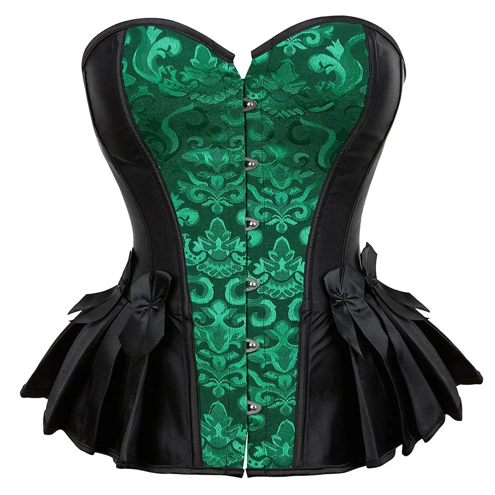 Das Grünes Viktorianisches Steampunk Korsett vereint die zeitlose Eleganz viktorianischer Mode mit dem charakteristischen Ausdruck des Steampunk-Stils. Sein tiefgrüner Brokatstoff mit edlem floralen Muster erinnert an luxuriöse Ballkleider vergangener Jahrhunderte, während die schwarzen Satinakzente und Falteneinsätze einen Hauch von Dramatik und Raffinesse hinzufügen.