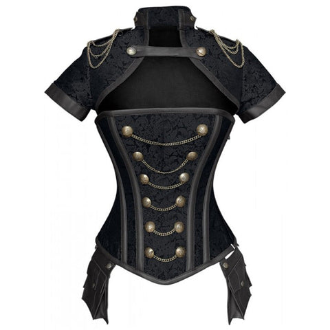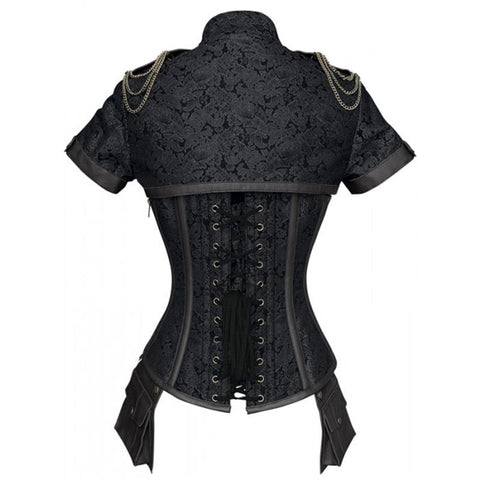 Der Brokatstoff zeigt subtile florale Muster, die das Korsett mit einem Hauch von Noblesse veredeln, während das dunkle Kunstleder die Linien betont und die Taille definiert. Jeder Knopf, jede Kette und jede Naht scheint Teil einer größeren Geschichte zu sein – die eines Offiziers, der die Regeln neu schreibt und die Zukunft selbst bestimmt.