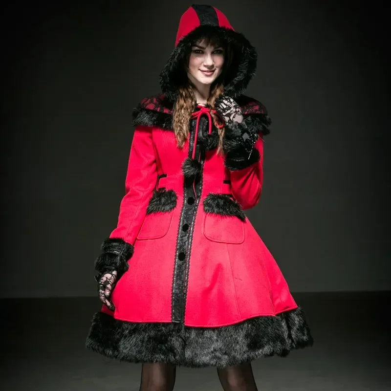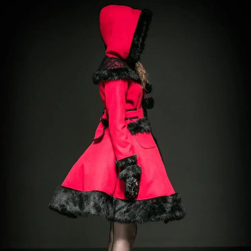 Feine Verzierungen entlang des Saums und der Ärmel schaffen eine romantische Optik, während die Kapuze nicht nur dekorativ, sondern auch funktional ist – ideal für kühle Tage und märchenhafte Winterspaziergänge. Die taillierte Form betont die Figur und sorgt für eine feminine Ausstrahlung, die den Look zwischen Eleganz und Nostalgie perfekt ausbalanciert.