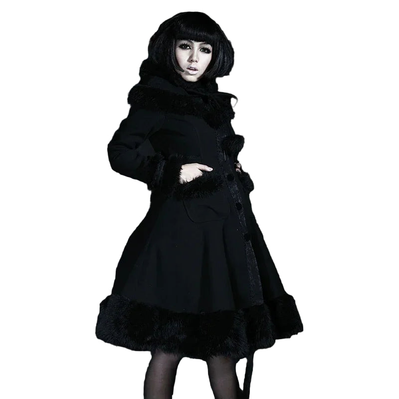 Der Steampunk Lolita Wintermantel vereint den verspielten Charme des Lolita-Stils mit der erhabenen Eleganz viktorianischer Mode. Sein ausgestellter Schnitt, die zarten Schleifendetails und die edle Kapuze mit Fellbesatz verleihen ihm eine anmutige Silhouette, die Wärme und Stil perfekt miteinander kombiniert.