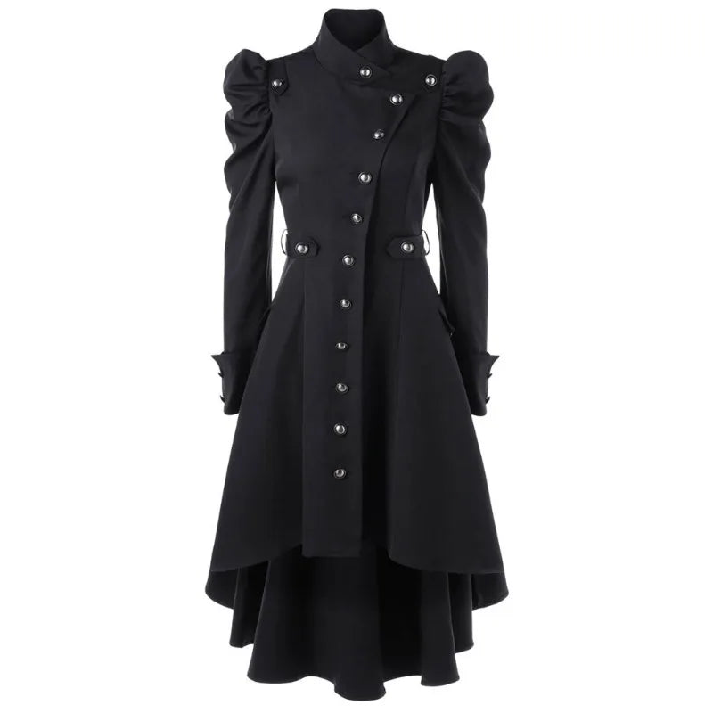 Der Steampunk Mantel Hochstehkragen ist ein Meisterwerk viktorianischer Eleganz und industrieller Stärke. Sein asymmetrischer Schnitt und die aufwendig gestaltete Knopfleiste verleihen ihm eine markante Silhouette, die Tradition und Rebellion zugleich verkörpert – perfekt für Frauen, die Stil mit Charakter tragen.