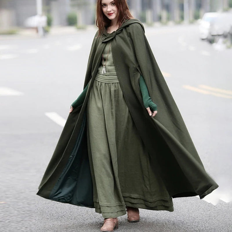 Die großzügige Kapuze bietet Schutz vor Wind und Blicken – perfekt für Spaziergänge durch Wälder, Festivals oder Steampunk-Conventions. Das weiche Mischgewebe aus Polyester, Kaschmir und Nylon sorgt für Wärme und fließende Bewegung, während der weite Schnitt dem Mantel seine dramatische Silhouette verleiht.
