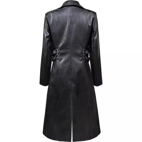 Das Design in Lederoptik verleiht dem Mantel nicht nur eine robuste Ausstrahlung, sondern auch einen Hauch von militärischer Strenge. Die seitlichen Riemen und Metallschnallen betonen die Taille und verstärken den kämpferischen Charakter. Ein Mantel, der dich in die Welt von Dieselpunk-Ästhetik entführt – düster, industriell, kompromisslos.