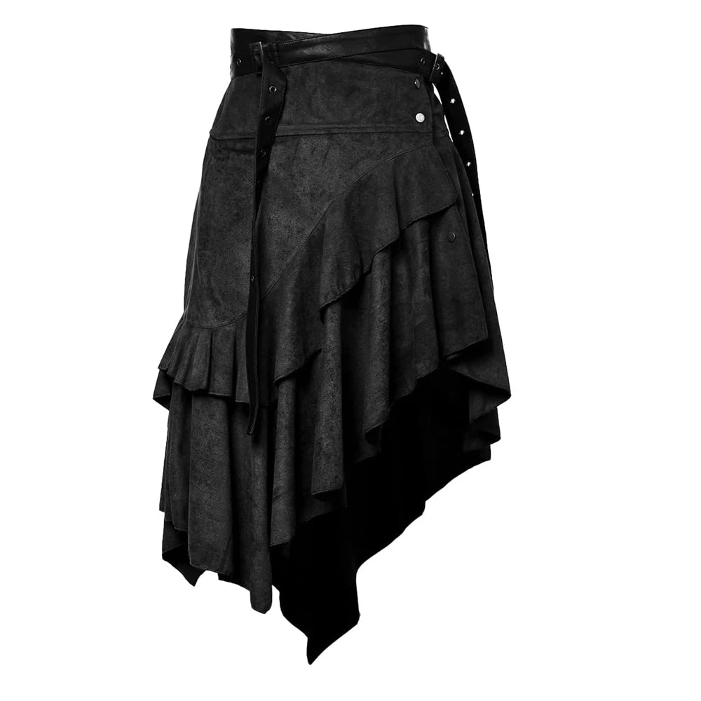 Der Asymmetrischer Steampunk Rock ist eine Hommage an mutige Entdeckerinnen und stilbewusste Abenteurer. Sein mehrlagiger Schnitt mit unregelmäßig fallenden Volants erzeugt eine dynamische Silhouette, die zugleich kraftvoll und elegant wirkt. Die strukturierte Oberfläche erinnert an robustes Wildleder, während der verstellbare Taillengürtel mit messingfarbenen Nieten dem Look eine authentische Steampunk-Note verleiht.