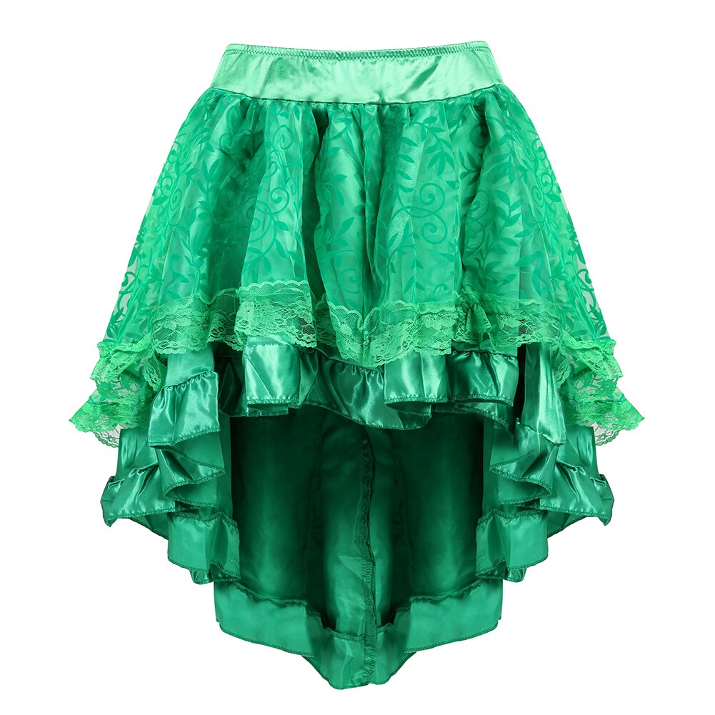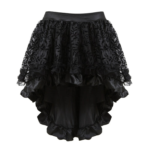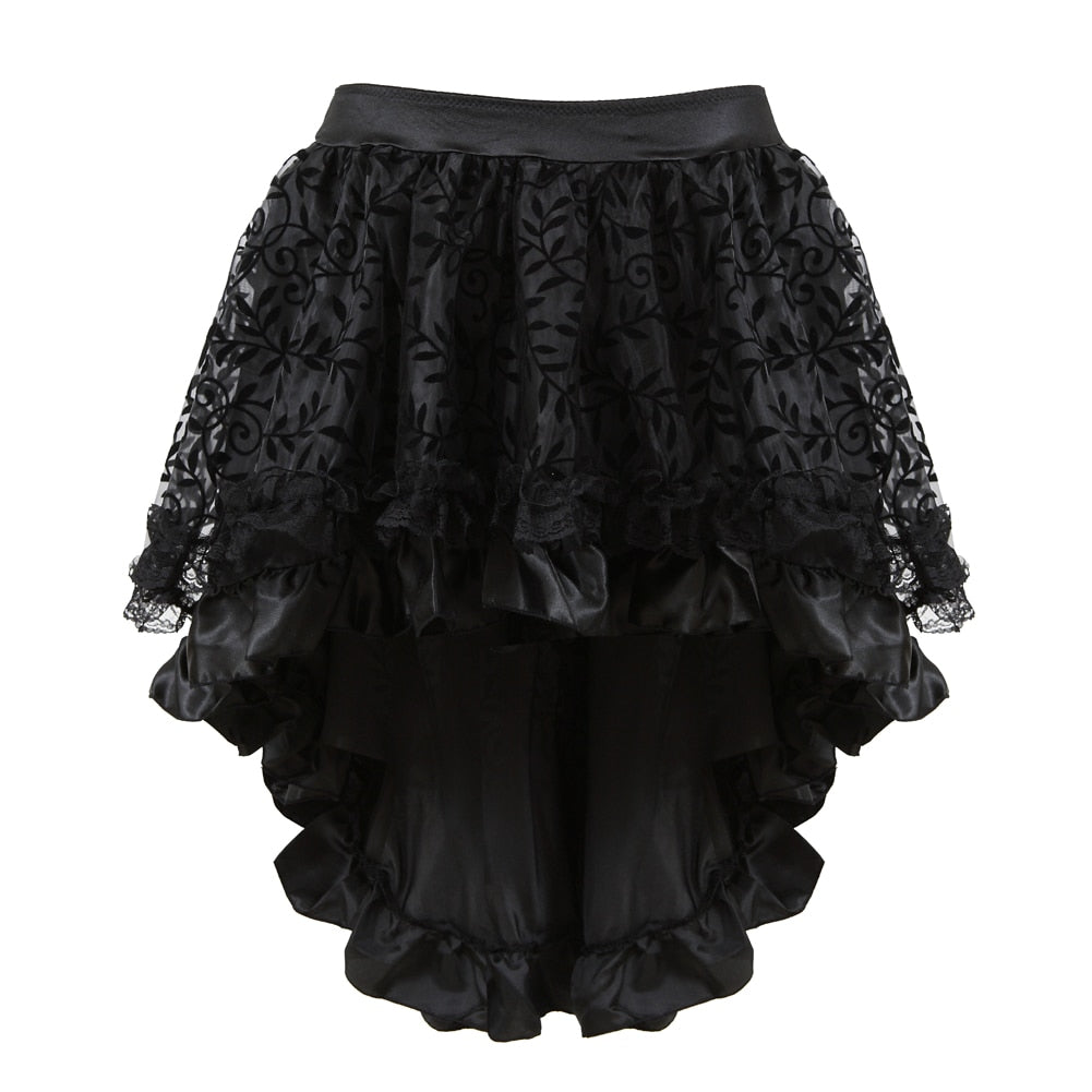 Der Steampunk Burlesque Spitzenrock verbindet sinnliche Burlesque-Attitüde mit viktorianischem Charme. Über glänzendem Satin liegt eine zarte, transparent schimmernde Spitze mit rankenartigem Muster – leicht, geheimnisvoll und voller Tiefe.