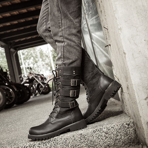 Die massiven Schnürungen werden von drei breiten Metallschnallen verstärkt, die nicht nur Halt geben, sondern auch den martialischen Charakter dieser Stiefel unterstreichen. Das robuste Kunstleder trotzt Staub, Schmutz und Abenteuern, während die dicke Sohle für festen Halt auf jedem Untergrund sorgt – sei es in urbanen Ruinen oder auf offener Straße. Perfekt für Cosplayer, Biker oder Männer, die ihren Look mit einem Hauch von Apokalypse vollenden wollen.