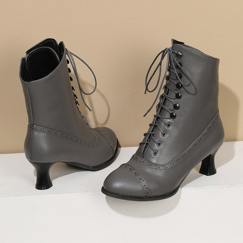 Der niedrige Absatz sorgt für einen komfortablen Stand, während die hochwertige Verarbeitung Stabilität und Haltbarkeit garantiert. Ihr klassisches Design, inspiriert von viktorianischen Damenstiefeln, verleiht jedem Outfit einen Hauch von Theater, Geschichte und geheimnisvoller Stärke.