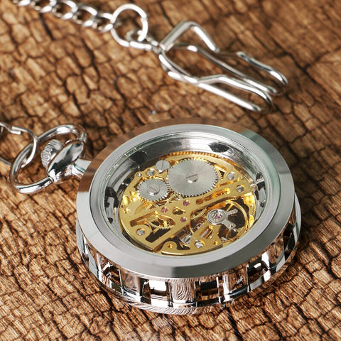 Der glänzende silberne Rahmen bildet einen faszinierenden Kontrast zu den goldfarbenen Zahnrädern im Inneren und lässt die Uhr zu einem auffälligen Accessoire werden. Ob bei einem viktorianischen Kostüm, einem edlen Abendoutfit oder als Sammlerstück in einer Vitrine – diese Taschenuhr verkörpert zeitlose Eleganz und technische Raffinesse. Sie ist nicht nur ein praktischer Zeitmesser, sondern auch ein Ausdruck von Stil, Persönlichkeit und Abenteuerlust.