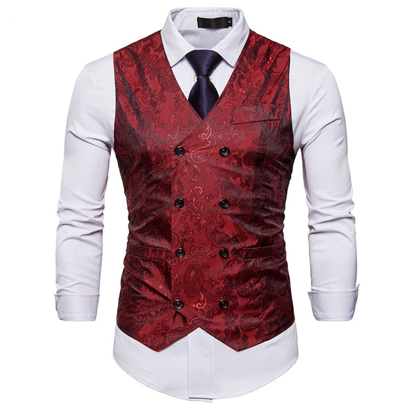 Das tiefrote Brokatmuster ist reich verziert und entfaltet im Licht ein faszinierendes Spiel aus Tiefe und Glanz. Mit ihrer doppelreihigen Knopfleiste und dem taillierten Schnitt formt die Weste eine Silhouette, die gleichermaßen würdevoll wie kraftvoll wirkt. Sie passt perfekt zu weißen Hemden, dunklen Anzughosen oder einem kompletten Steampunk-Outfit – ein Highlight, das jede Erscheinung kaiserlich abrundet.
