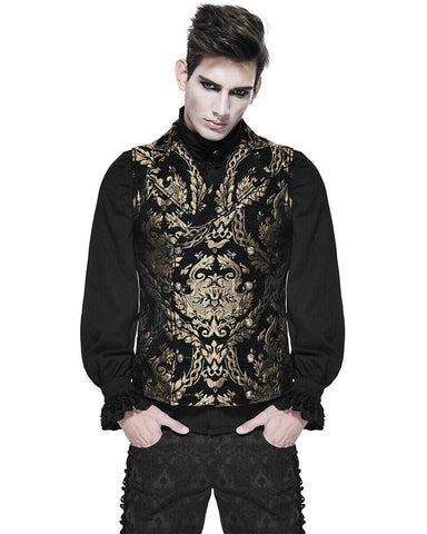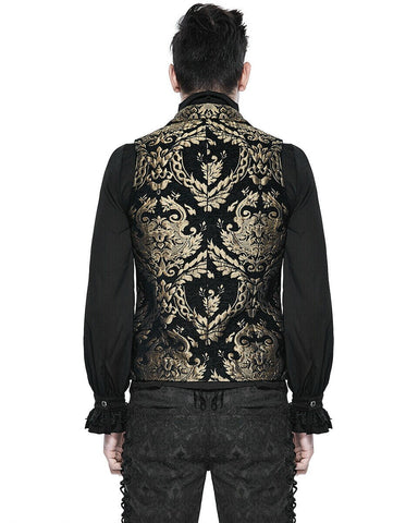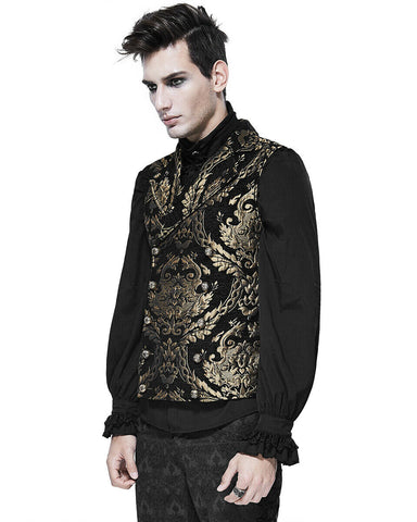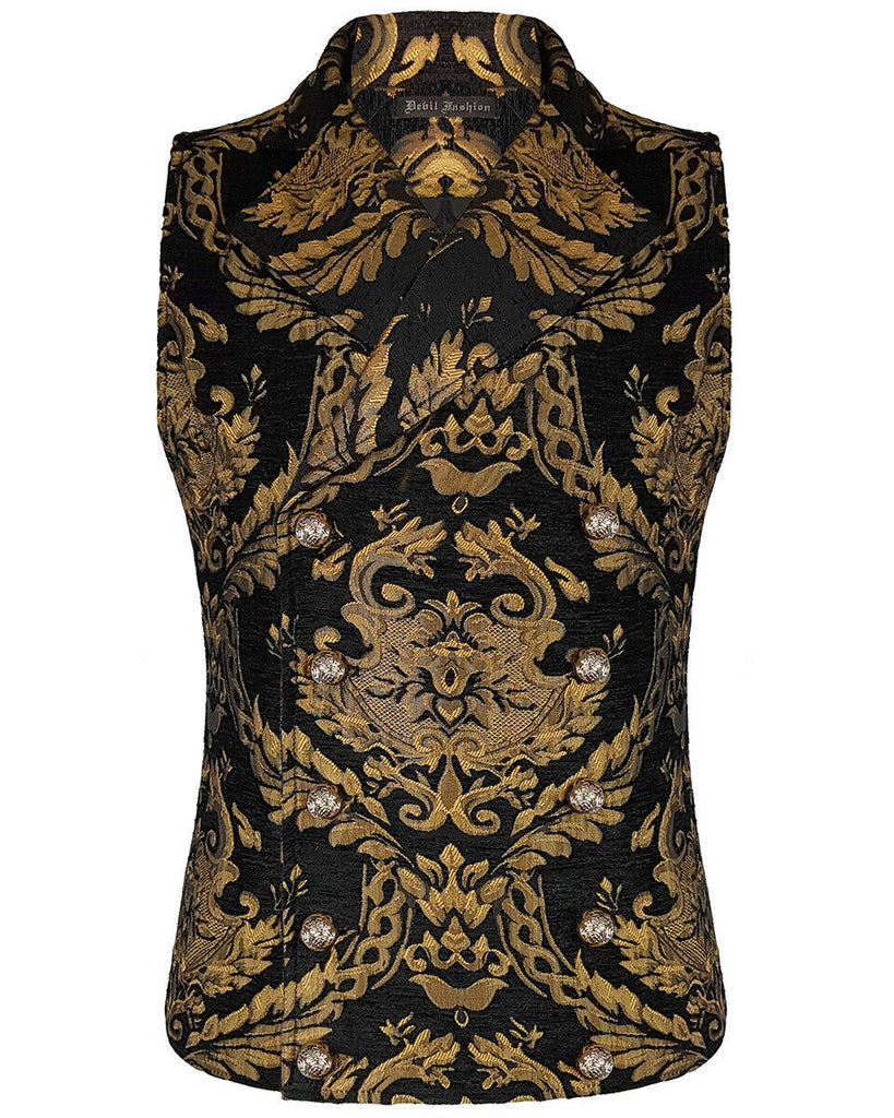 Das aufwendige Brokatmuster in tiefem Schwarz und schimmerndem Gold erinnert an die Pracht königlicher Gewänder. Verziert mit kunstvoll gearbeiteten Knöpfen, strahlt diese Weste Autorität und Raffinesse aus. Ob zu einer Gala, einem historischen Ball oder als Teil eines imposanten Outfits – sie ist das Kleidungsstück, das Blicke fesselt und Respekt einflößt.