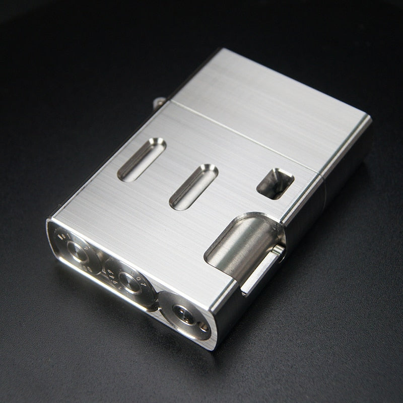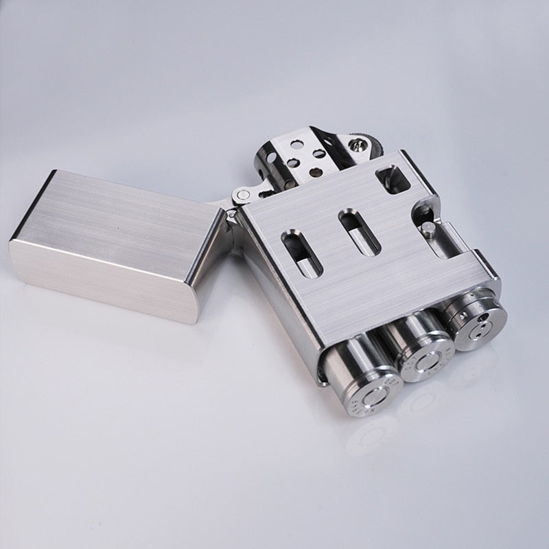 Die Form und die Details dieses Feuerzeugs erinnern an Patronenhülsen, was ihm einen markanten, industriellen Look verleiht. Das robuste und stilvolle Design macht es zu einem perfekten Begleiter für Outdoor-Aktivitäten oder als Sammlerstück für Liebhaber außergewöhnlicher Accessoires.