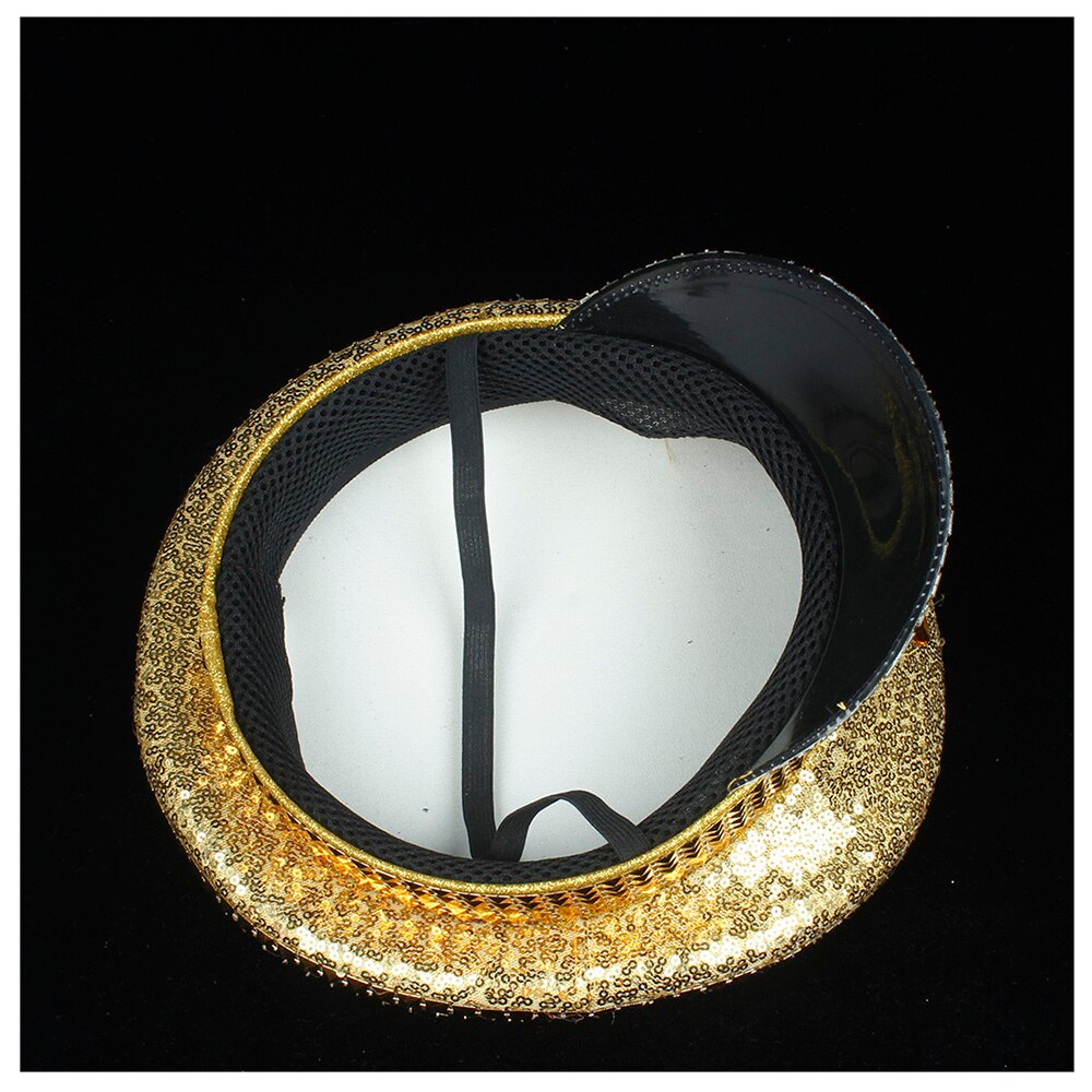 Der Hut ist mit funkelnden goldenen Pailletten überzogen, die im Licht glitzern und einen Hauch von Luxus und Raffinesse hinzufügen. Die Ränder sind mit goldenen Nieten besetzt, die nicht nur die Struktur verstärken, sondern auch einen Hauch von Robustheit und Beständigkeit verleihen. An der Vorderseite des Hutes sind große, bernsteinfarbene Edelsteine angebracht, die wie königliche Insignien glänzen und den Status des Trägers unterstreichen.