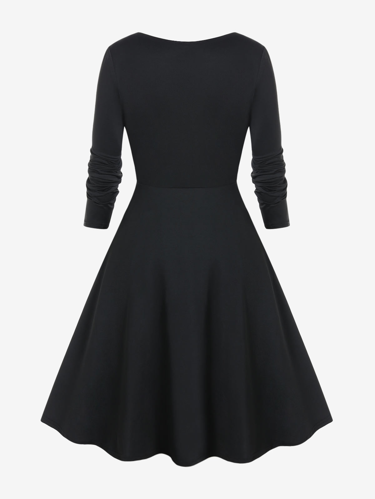 Die Metalldetails am Dekolleté und die Korsettgürtel sorgen für eine robuste und gleichzeitig raffinierte Note. Perfekt für Liebhaber der Gothic-Mode, eignet sich dieses Kleid ideal für besondere Anlässe, Themenpartys oder einfach, um Ihre Individualität im Alltag auszudrücken.