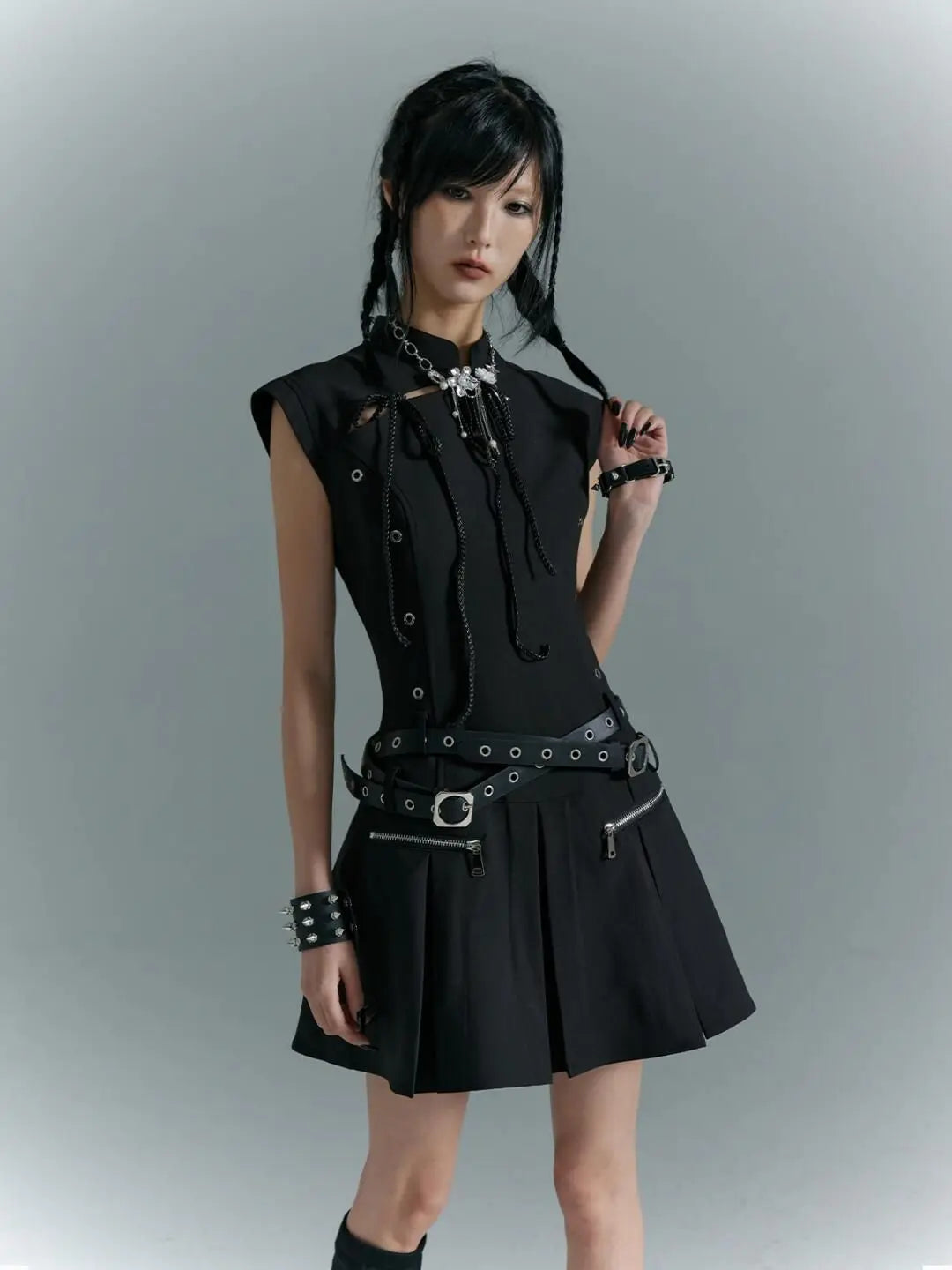 Der strukturierte Schnitt mit betonten Schultern und gefaltetem Rockteil schafft eine starke, selbstbewusste Silhouette. Die silbernen Schnallen und Reißverschlüsse bringen einen Hauch von Industrial-Punk, während der knielange Schnitt Eleganz und Tragbarkeit vereint.
