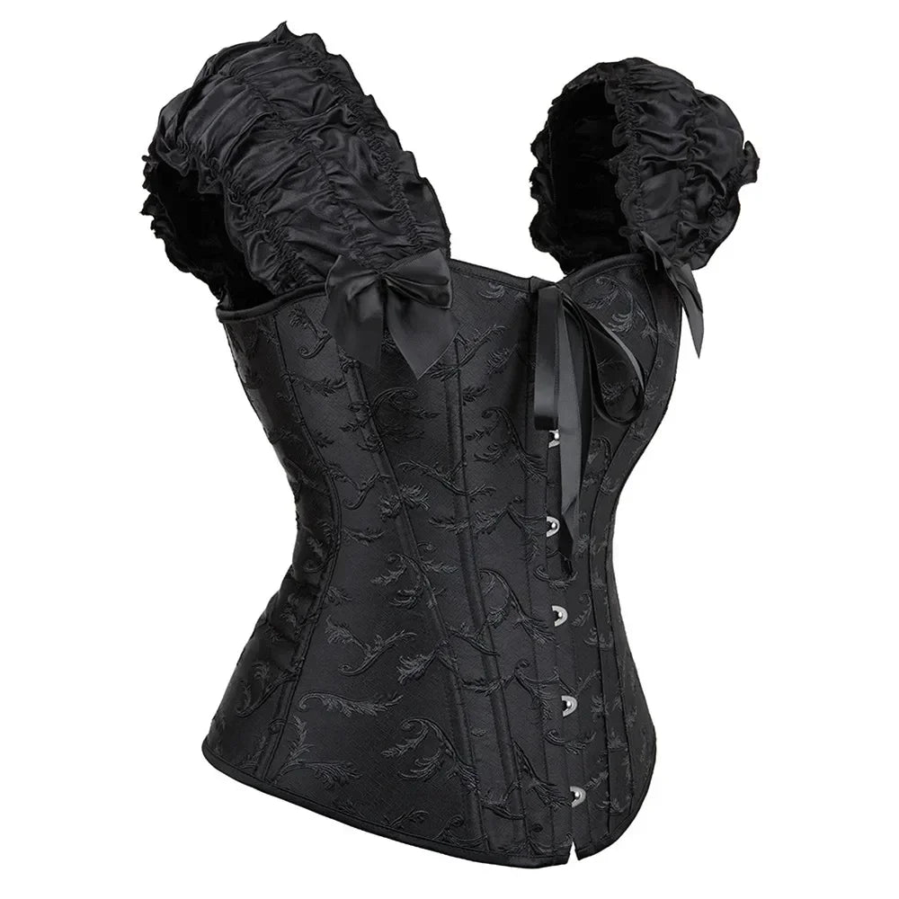 Die fein gearbeiteten Puffärmel aus glänzendem Stoff und die eleganten Schleifen verleihen dem Korsett eine romantische Note, während die stabile Front mit Hakenverschlüssen für einen sicheren Halt sorgt. Das florale Muster, eingearbeitet in den strukturierten Stoff, erinnert an die Textilien viktorianischer Salons – ein Symbol für Weiblichkeit, Sinnlichkeit und Charakter.
