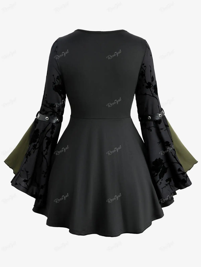 Die weit ausgestellten Trompetenärmel mit verzierten Schnallen wirken wie Rüstungsdetails und schaffen eine eindrucksvolle Silhouette voller Dynamik. Der asymmetrische, weit fallende Saum unterstreicht die dramatische Eleganz und verleiht jeder Bewegung eine theatralische Wirkung. Diese Bluse ist mehr als ein Kleidungsstück – sie ist ein Symbol für Entschlossenheit, Stärke und den unverwechselbaren Geist des Steampunk.