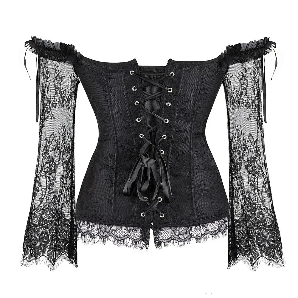 Das Bustier ist aus hochwertigen Materialien gefertigt, die gleichzeitig Struktur und Komfort bieten. Die Frontverschlüsse mit metallischen Knöpfen verleihen dem Design einen Hauch industrieller Nostalgie, während die florale Spitze an die Romantik vergangener Jahrhunderte erinnert. Der schulterfreie Schnitt mit den eleganten langen Ärmeln betont die Dekolleté-Linie auf eindrucksvolle Weise – ein Blickfang auf jedem Ball, Festival oder Fotoshooting.