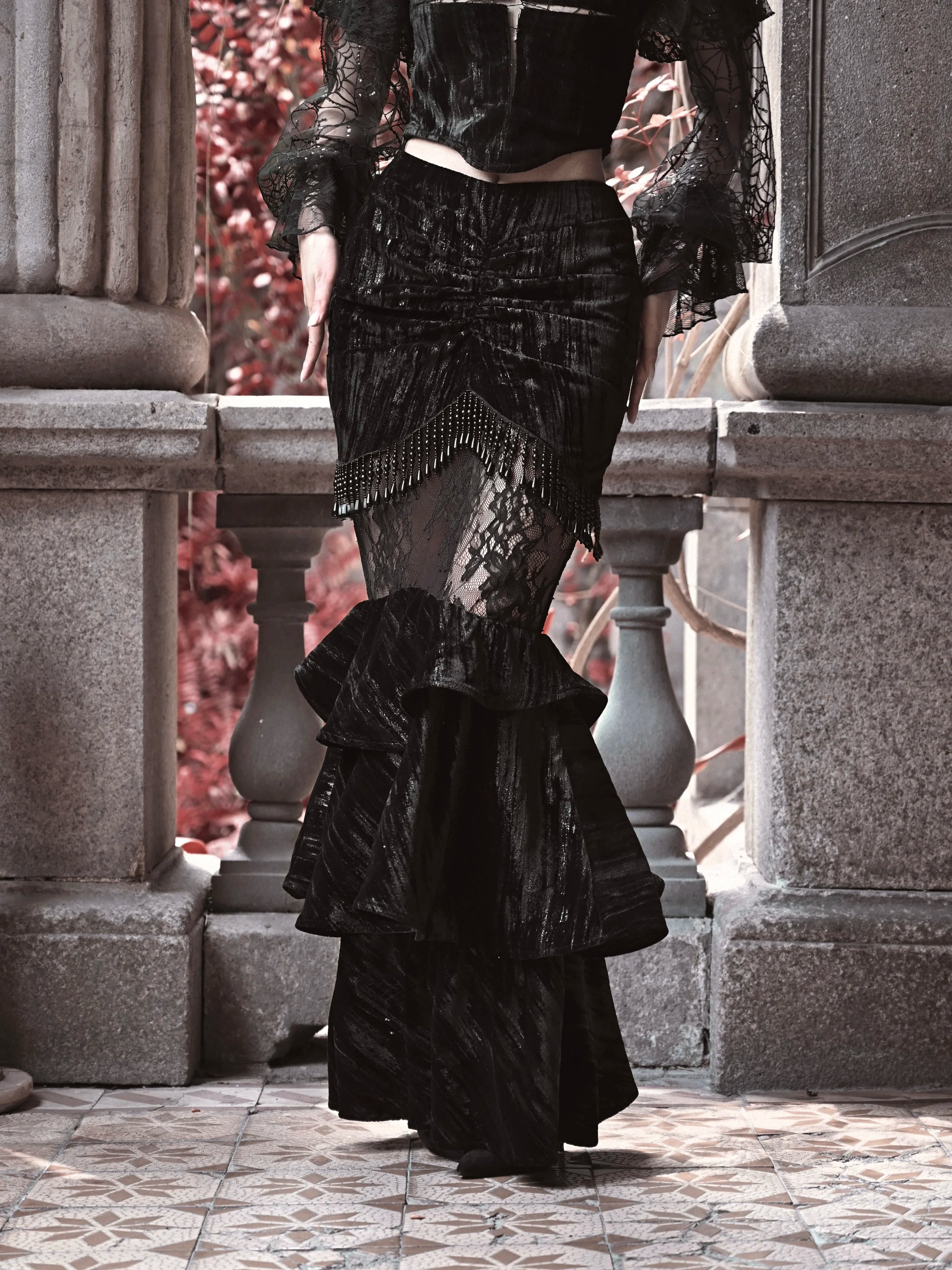 Die ornamentale Verzierung mit feinen Perlenfransen verleiht dem Design eine fast aristokratische Tiefe. Jeder Faltenwurf erzählt von Eleganz und Rebellion, geschaffen für jene, die Dunkelheit nicht fürchten, sondern in ihr Schönheit finden. Ideal für Festivals, Bühnenauftritte oder Abende, an denen Stil ein Statement ist.