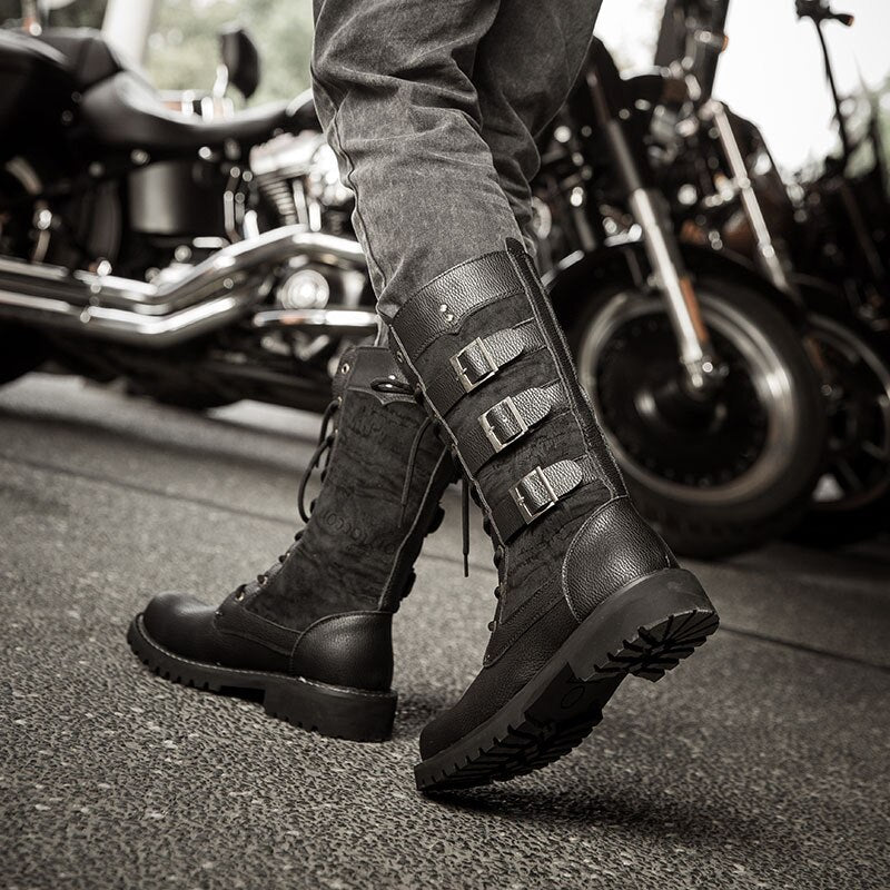 Die massiven Schnürungen werden von drei breiten Metallschnallen verstärkt, die nicht nur Halt geben, sondern auch den martialischen Charakter dieser Stiefel unterstreichen. Das robuste Kunstleder trotzt Staub, Schmutz und Abenteuern, während die dicke Sohle für festen Halt auf jedem Untergrund sorgt – sei es in urbanen Ruinen oder auf offener Straße. Perfekt für Cosplayer, Biker oder Männer, die ihren Look mit einem Hauch von Apokalypse vollenden wollen.