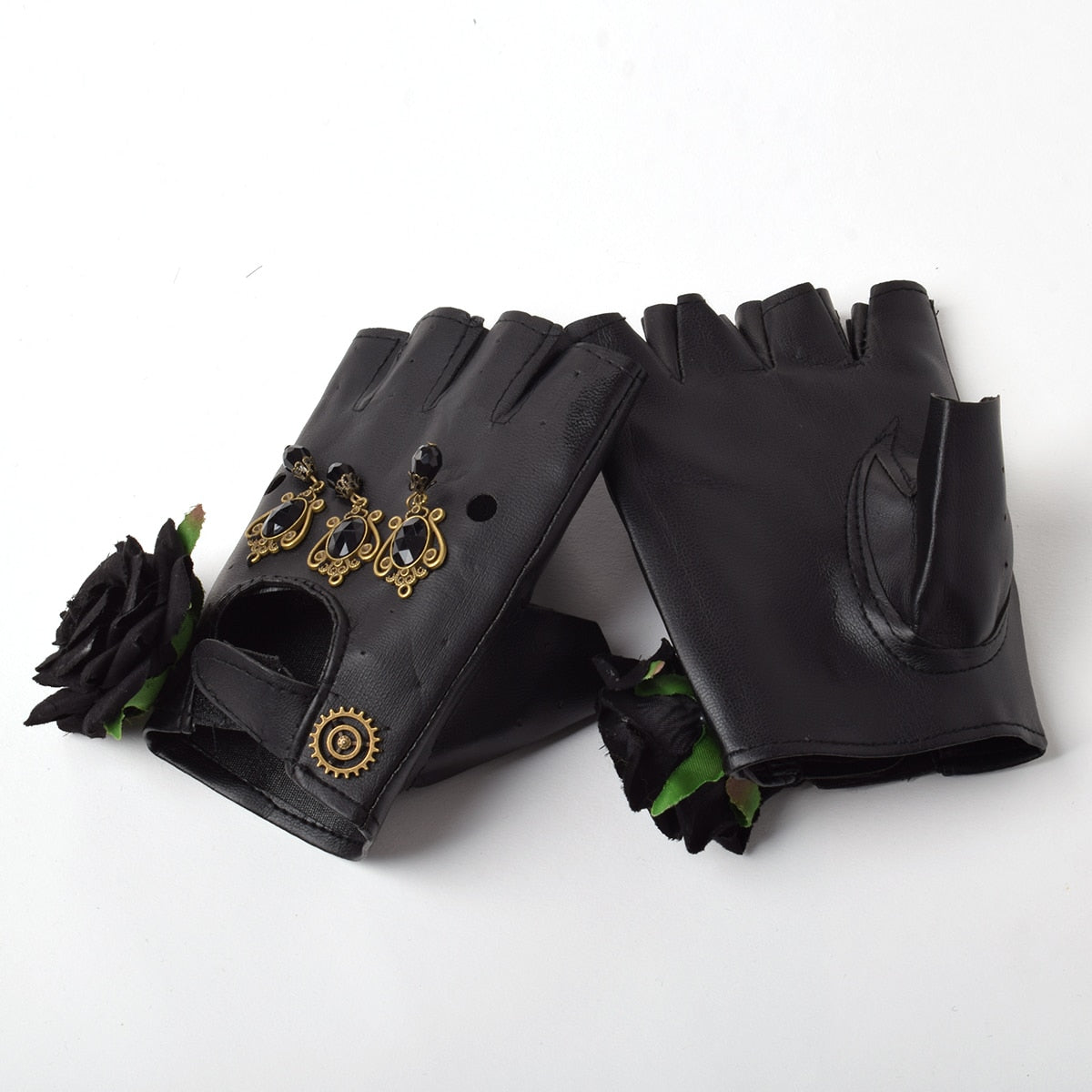 Diese wunderschönen Gothic Handschuhe mit Schmuck sind die perfekte Verkörperung des Steampunk-Stils. Hergestellt aus schwarzem Leder, zeigen sie elegante schwarze Rosen und subtile Metallzahnräder, die einen Hauch von mechanischer Raffinesse hinzufügen. Die gotischen Herzornamente mit hängenden schwarzen Steinen verstärken das geheimnisvolle und schicke Aussehen dieser Handschuhe.