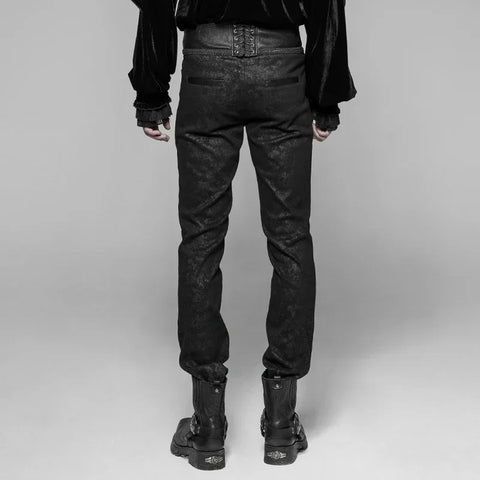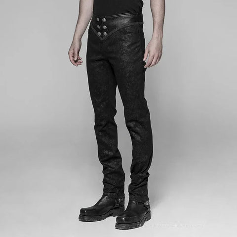 Die Schwarze Retro Gothic Hose verbindet klassische Eleganz mit dunkler Raffinesse. Ihr schmaler Schnitt und das dezente Muster verleihen ihr eine noble Ausstrahlung, während die vordere Knopfleiste mit verzierten Metallknöpfen den Retro-Charme vergangener Epochen zurückbringt. Diese Hose ist geschaffen für Männer, die Stil und Ausdruck schätzen.