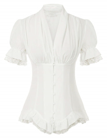 Die kurzen Puffärmel mit Spitzenabschluss sorgen für verspielte Details, die perfekt mit dem tiefen V-Ausschnitt und der schmalen Knopfreihe harmonieren. Am Saum sorgen dekorative Rüschen für einen leichten Schwung, der an viktorianische Damenmode erinnert. Ob kombiniert mit einem Lederkorsett, einem langen Rock oder einer High-Waist-Hose – diese Corsagenbluse verleiht jedem Outfit eine unverwechselbare Mischung aus Eleganz und Rebellion.