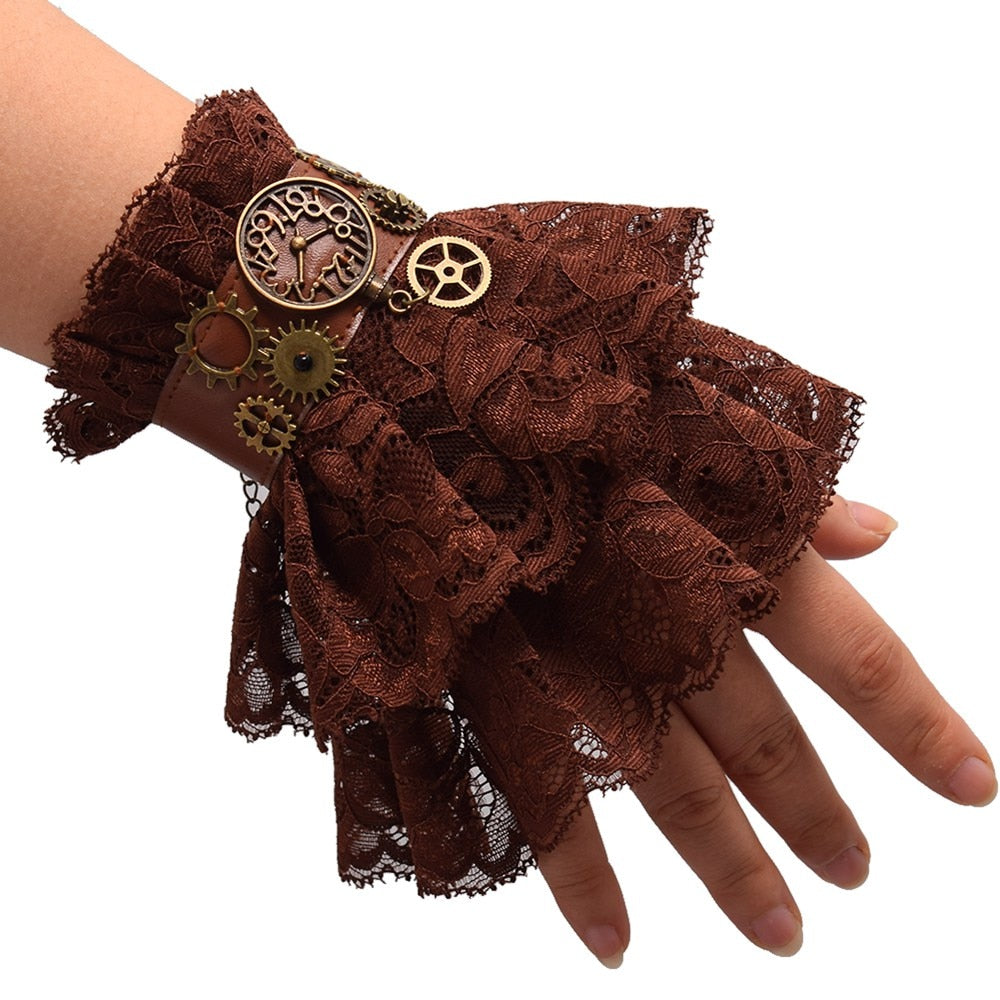 Verleihen Sie Ihrem Outfit einen Hauch viktorianischer Eleganz mit diesen Steampunk Damen Handschuhen. Die braunen Spitzenhandschuhe sind mit metallischen Zahnrädern verziert, die an das mechanische Zeitalter erinnern.