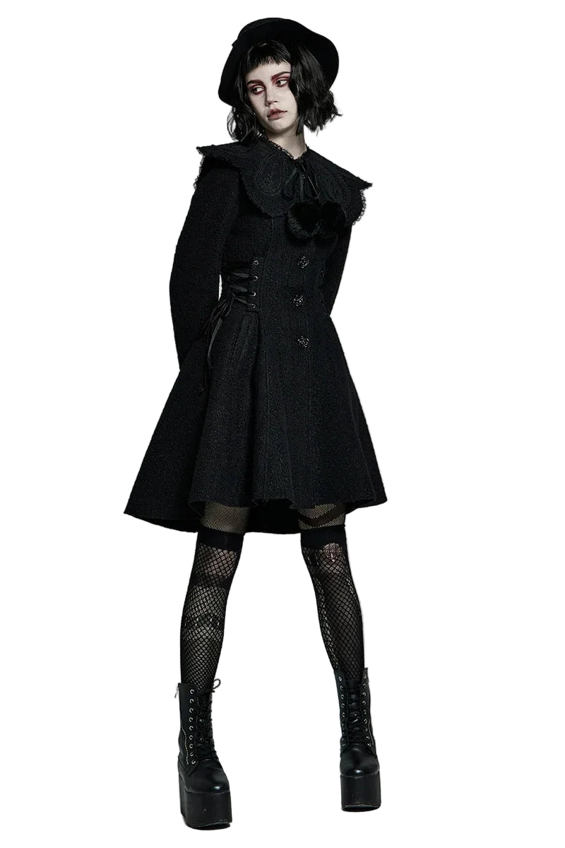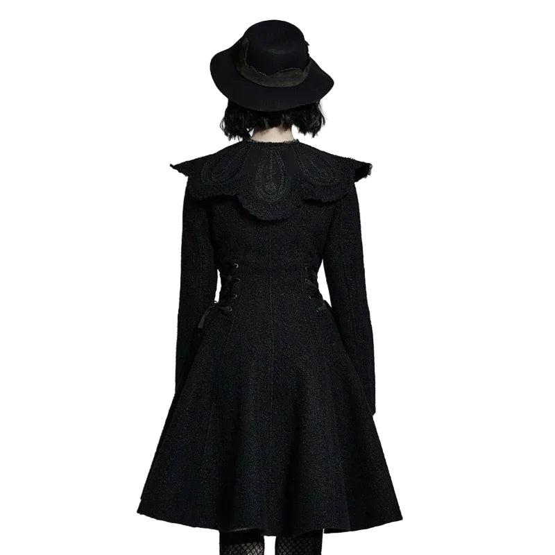 Der großzügige Kragen mit dekorativen Bommeln und feiner Schleifenbindung verleiht dem Mantel einen romantischen Akzent, während die feinen Nähte und die schmale Taille die Figur elegant betonen. Die kunstvollen Knöpfe und das strukturierte Material sorgen für einen authentischen, hochwertigen Look, der an die Mode vergangener Jahrhunderte erinnert.
