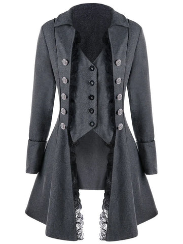 Seine doppelte Knopfreihe mit metallischen Zierknöpfen erinnert an die präzise Eleganz militärischer Uniformen, während die filigranen Spitzenverzierungen entlang der Innenseite einen Hauch von Romantik verleihen. Die taillierte Passform betont anmutig die Figur, während der asymmetrisch geschnittene Saum mit seiner schwungvollen Form für Dynamik und Bewegung sorgt.