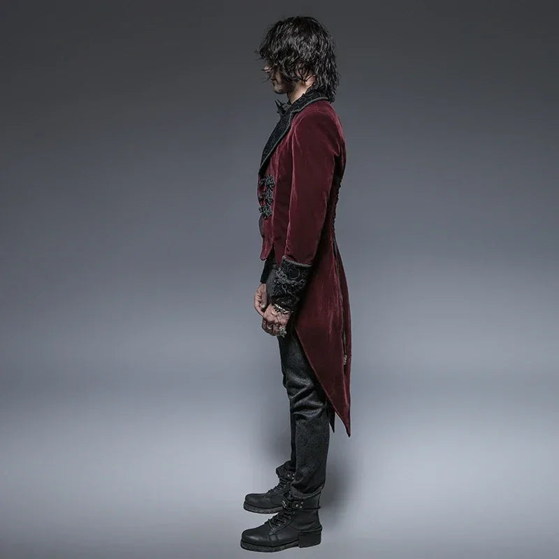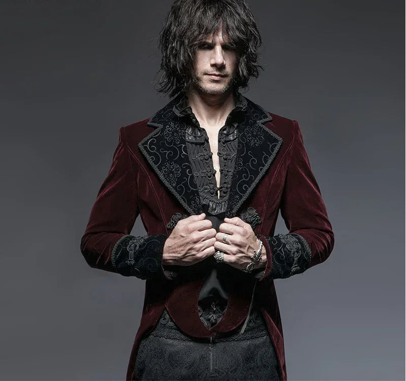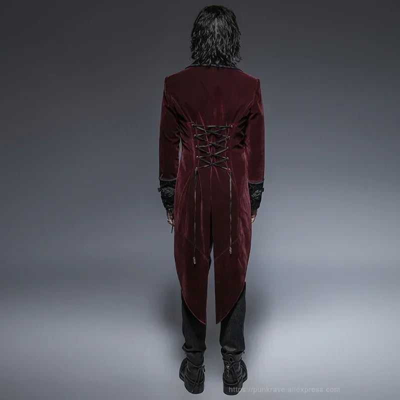 Das samtartige Obermaterial verleiht dem Mantel Tiefe und Noblesse, während die dekorativen Verschlüsse auf der Vorderseite und die raffinierte Schnürung am Rücken für eine perfekte Passform sorgen. Die feinen Stickdetails an Kragen und Manschetten runden das Design kunstvoll ab – eine Hommage an Handwerkskunst und Fantasie.