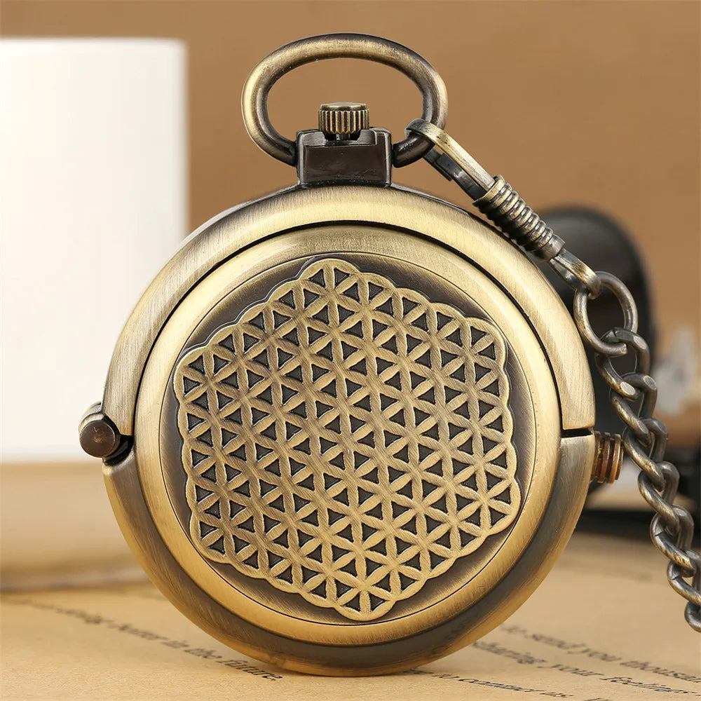 Die Steampunk Geometrie Taschenuhr verbindet die Präzision viktorianischer Uhrmacherkunst mit der zeitlosen Symbolik der heiligen Geometrie. Auf der Außenseite des Deckels prangt das „Blume des Lebens“-Muster – ein uraltes Symbol für Harmonie, Vollkommenheit und die Ordnung des Universums. Beim Öffnen offenbart sich ein detailreiches Skelett-Zifferblatt, das mit römischen Ziffern in Rot auf schwarzem Grund kunstvoll gestaltet ist.
