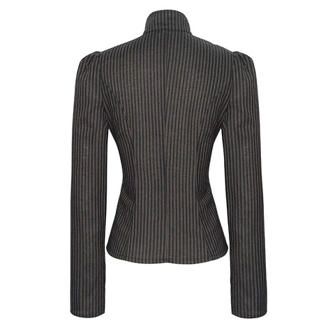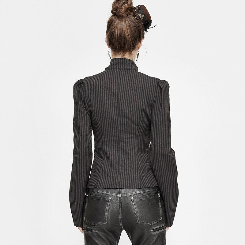 Das tiefe Dekolleté mit Rüschenbesatz setzt ein dramatisches Statement, während die langen, schmalen Ärmel für eine schlanke Silhouette sorgen. Die glänzenden Knöpfe in Kontrast zu den dunklen Streifen unterstreichen die edle Ausstrahlung. Perfekt kombinierbar mit Korsetts, Röcken oder Hosen aus Leder – ideal für Festivals, Kostüme oder einen unverwechselbaren Gothic-Look im Alltag.