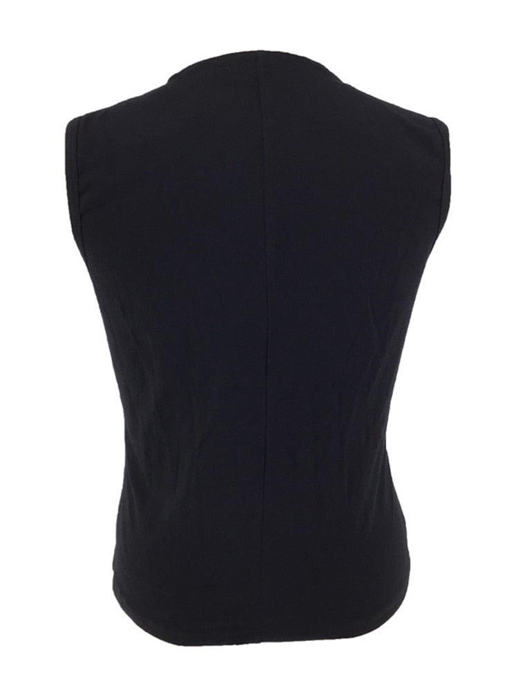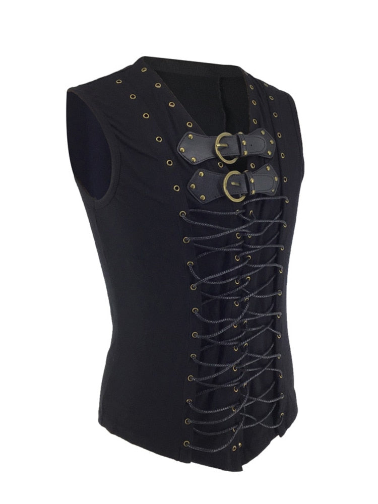 Das markante Schnürmuster auf der Vorderseite, verstärkt durch robuste Ösen und detailreiche Metallverschlüsse, vermittelt den Eindruck eines Rüstungsstücks – als hätte man gerade die Werkstatt eines Steampunk-Erfinders verlassen, bereit für Abenteuer in geheimnisvollen Maschinenstädten. Die dekorativen Schnallen unterstreichen den kraftvollen Look und geben der Weste eine unverkennbare Silhouette.