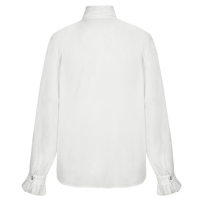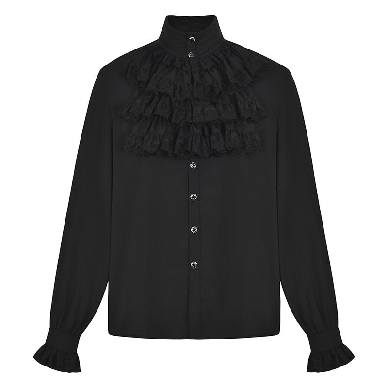 Der hochgeschlossene Kragen verleiht dem Hemd einen würdevollen Ausdruck, während die langen Ärmel mit feinen Spitzendetails an den Manschetten einen Hauch aristokratischer Raffinesse ausstrahlen. Jedes Detail erzählt eine Geschichte – vom Ballsaal der Oberschicht bis zum geheimnisvollen Labor eines Steampunk-Erfinders.